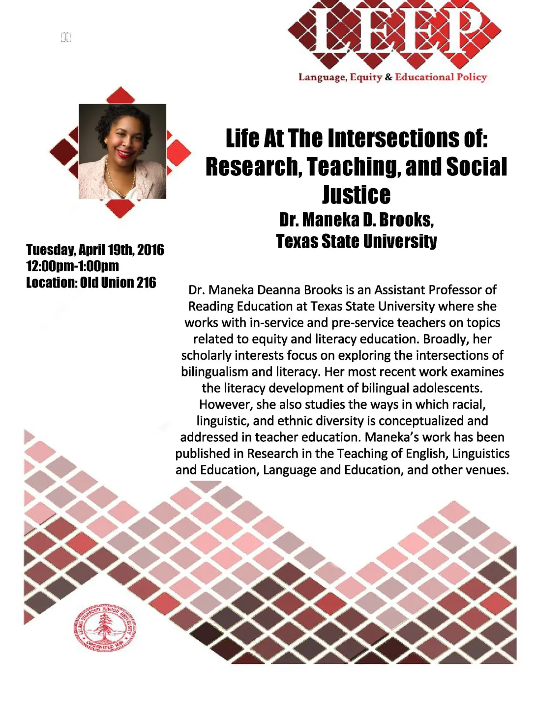 LEEP Seminar: Life at the intersections of research, teaching and social justice (A talk by Maneka D. Brooks) Tuesday, Apr 19 201612:00pm Old Union 216 This event is open to the public, but a RSVP is requested. Go to all events