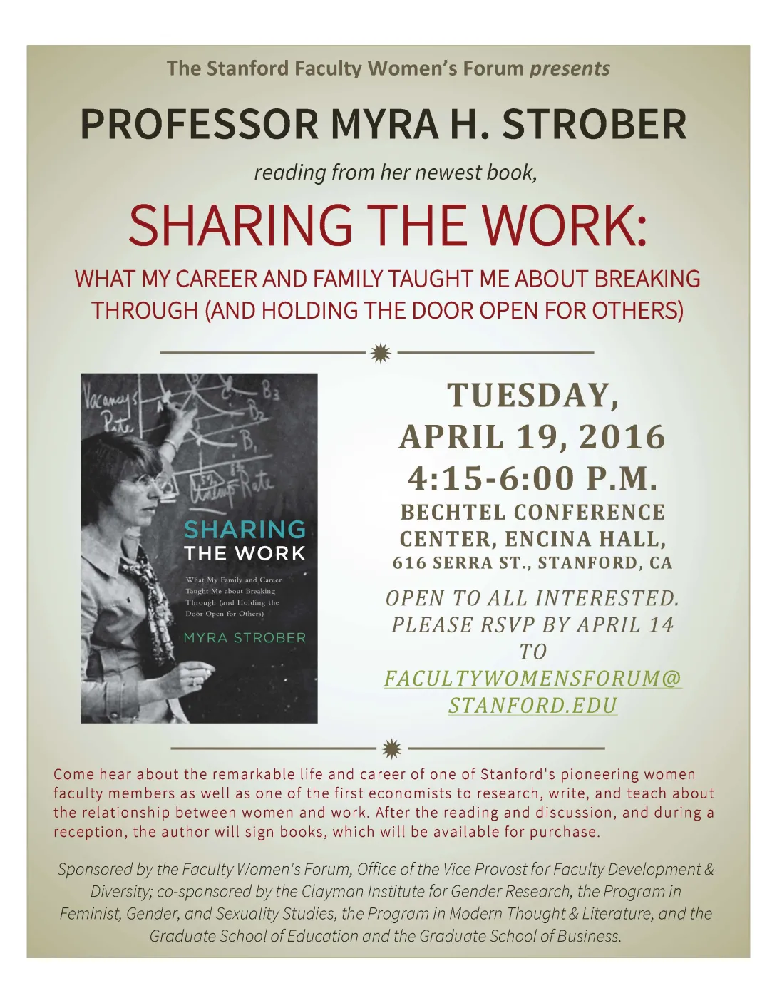 This program is sponsored by the Faculty Women's Forum, Office of the Vice Provost for Faculty Development & Diversity, and co-sponsored by the Clayman Institute for Gender Research, the Program in Feminist, Gender, and Sexuality Studies, the Program in Modern Thought & Literature, the Graduate School of Education, the Graduate School of Business, and the Pioneering Women Project of the Stanford Historical Society's Oral History Program.