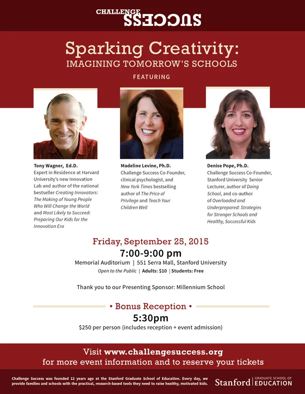 Join Challenge Success for our biggest parent education event of the year — "Sparking Creativity: Imagining Tomorrow's Schools." The event will feature keynote speaker Tony Wagner, Expert in Residence at Harvard University’s new Innovation Lab and author of the national bestseller Creating Innovators: The Making of Young People Who Will Change the World and Most Likely to Succeed: Preparing Our Kids for the Innovation Era. He will be joined by Challenge Success Co-Founders, Dr. Denise Pope and Dr. Madeline Levine, for an interactive discussion on fostering creativity in schools and at home: How do we encourage creativity in our kids and develop a generation of innovators and problem solvers? How can educators and parents spark creativity in daily activities? What is the connection between creativity and authentic success?