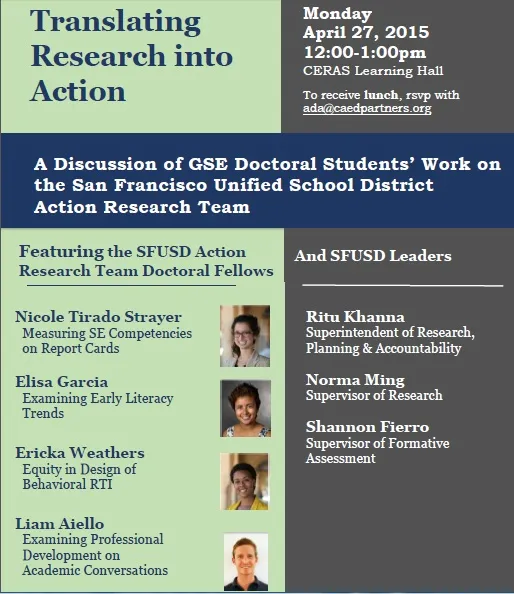 The San Francisco Unified School District (SFUSD) Action Research Team, consisting of Stanford GSE doctoral students, conducts research on shortened timelines for SFUSD administrators to readily reference in decisions. This year’s Action Research Team delved into the topics of early literacy trends, formative measurements of social-emotional (SE) competencies, equity in the design of a behavioral Response to Instruction and Intervention (RTI) and examining the professional development around academic conversations in the classroom. In this event, the Action Research Team fellows along with their partner SFUSD leaders, will talk about their experiences with formulating and implementing timely practice-based research questions and models.